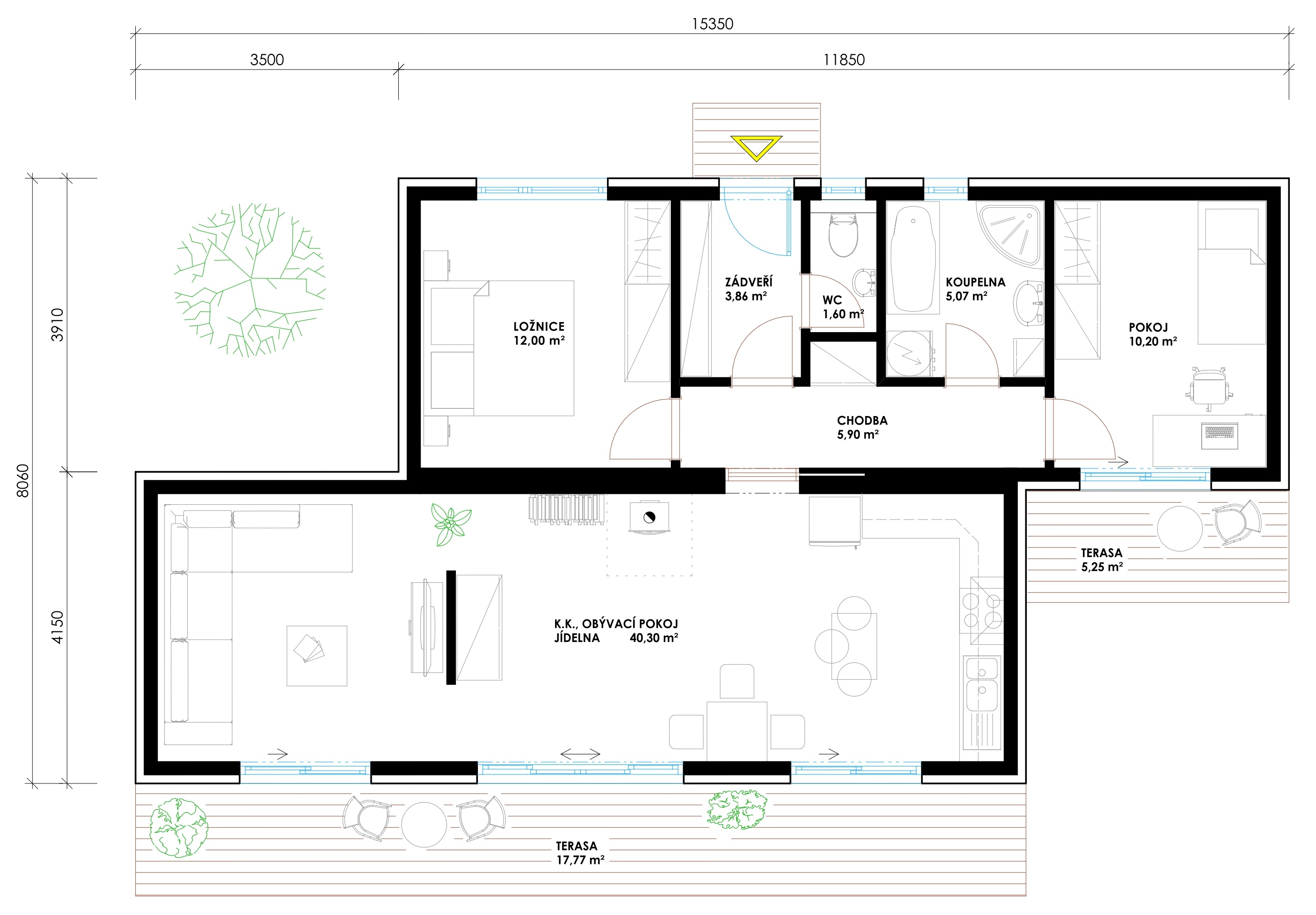 - Barva střechy a fasády dle vlastního výběru ze vzorníku, bez příplatku